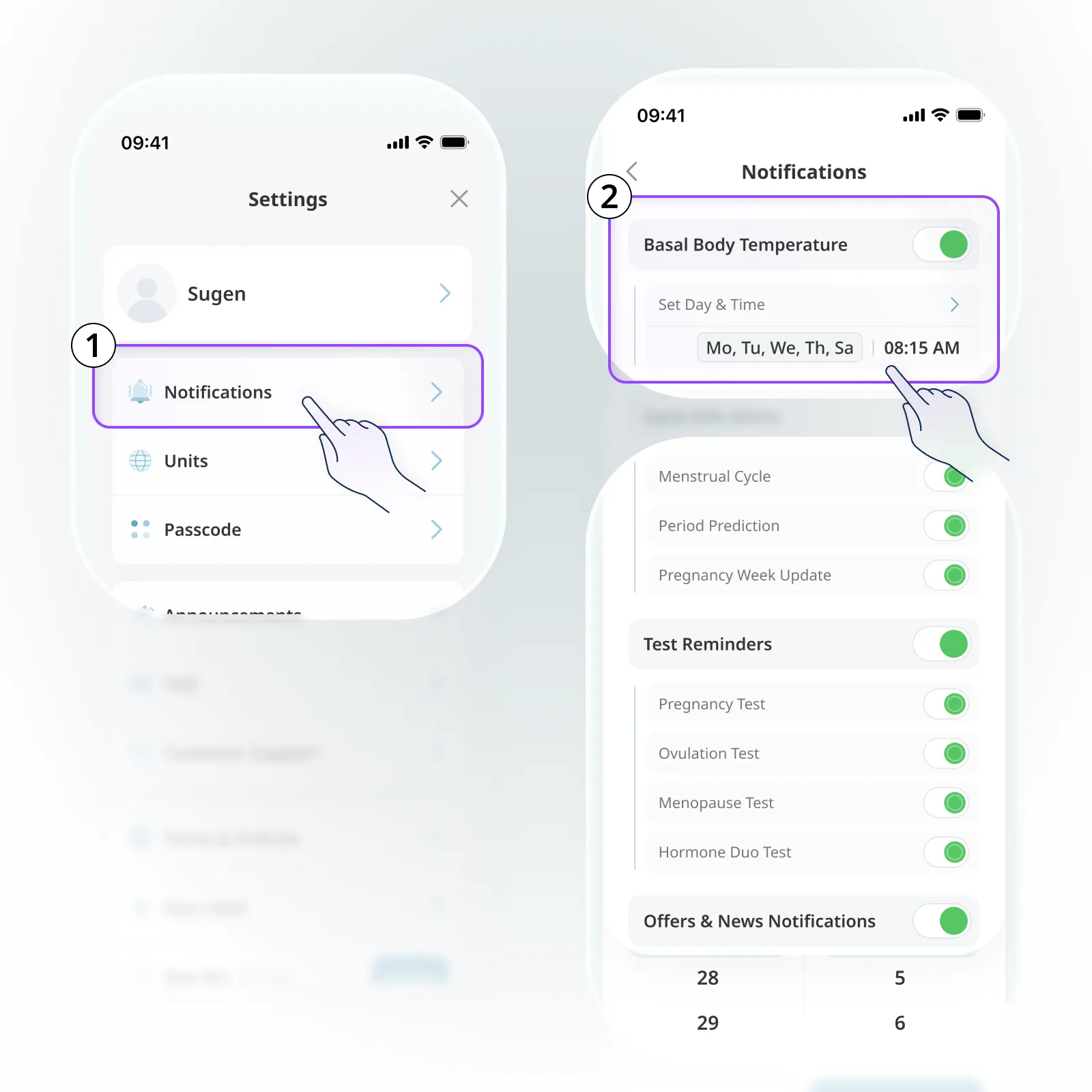 Go to App Settings → Notification Settings and turn on BBT Measurement Reminder to choose your preferred time and days. You can set one reminder per day. You can receive it at the same time every day, or only on specific days of the week.
