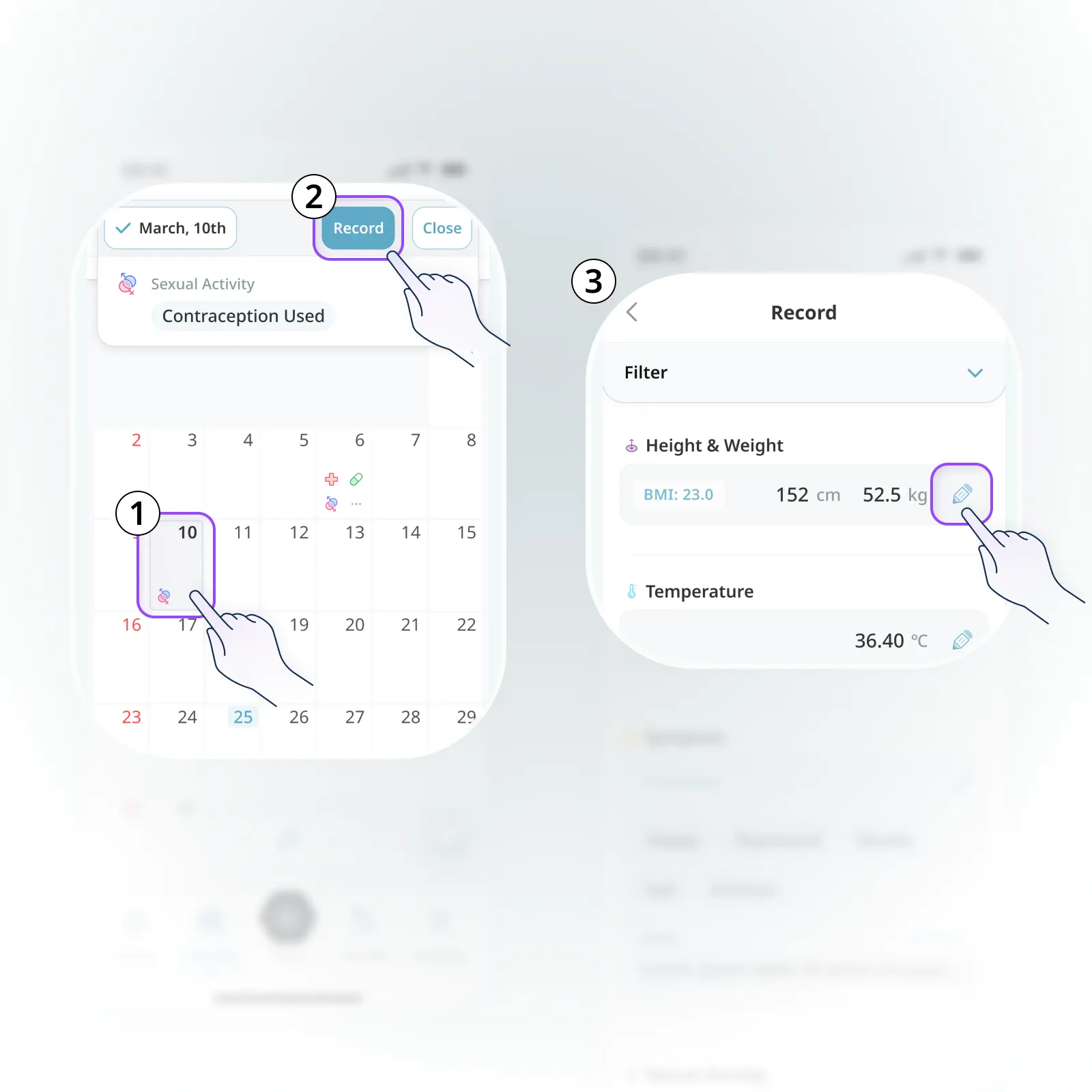 Here, you can easily log information such as height, weight, body temperature, symptoms, sexual activity, hospital visits, medication, and exercise.