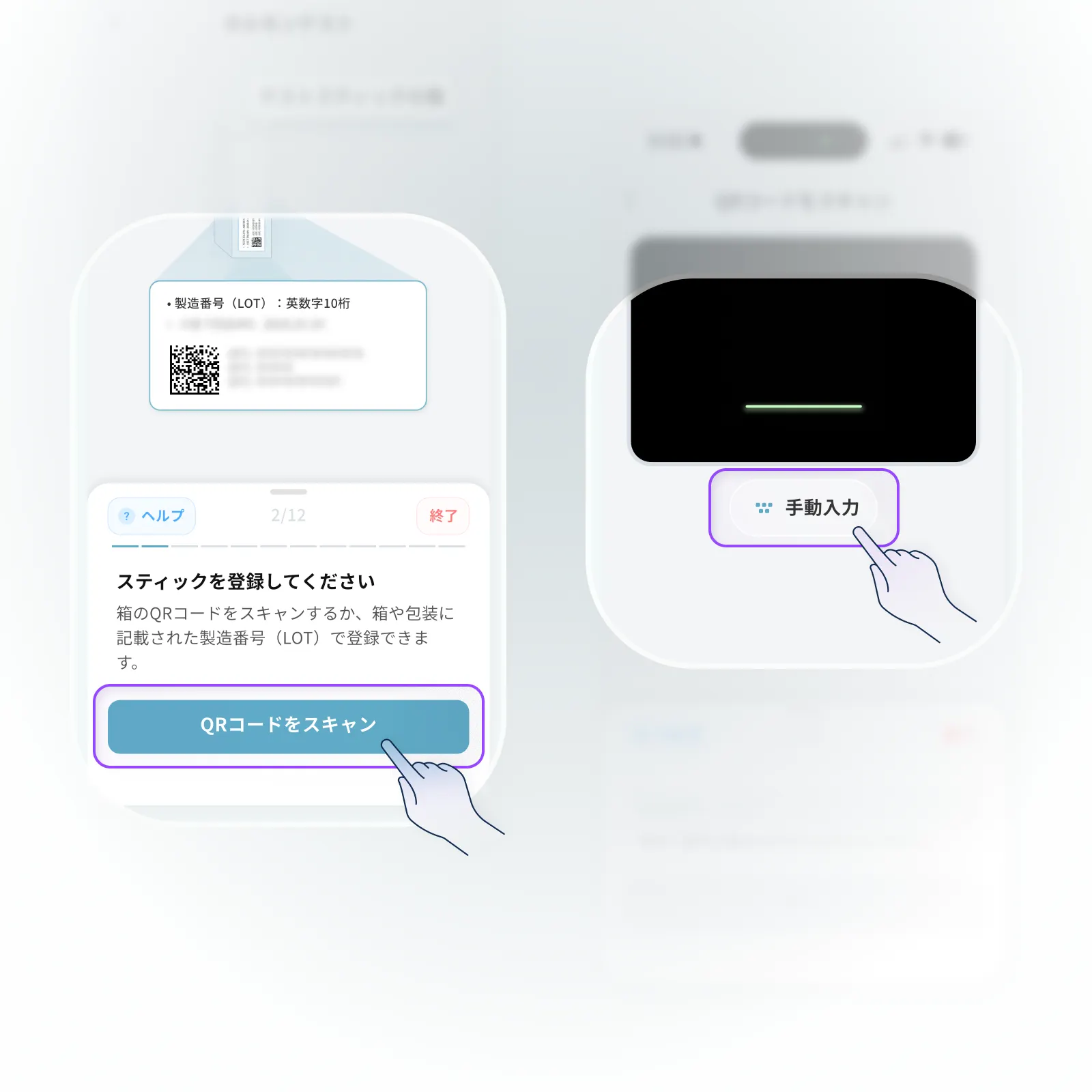 パッケージ箱の側面または個別スティックのフォイルパウチに印字されたLOT番号を、アプリに直接入力することもできます。